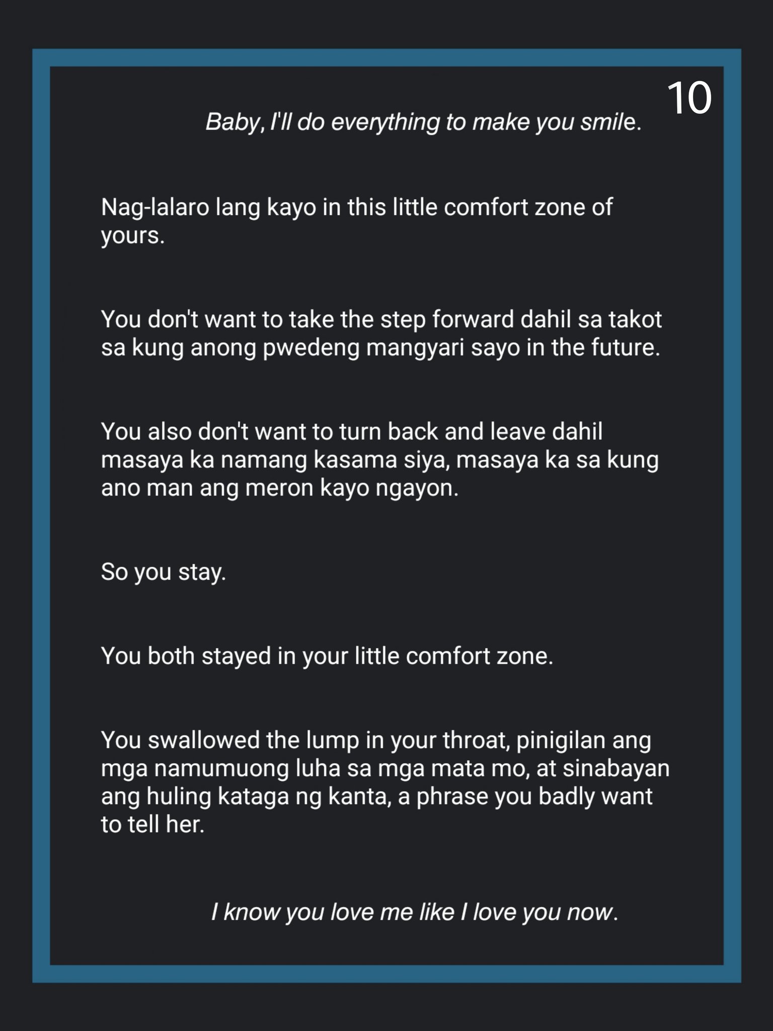 Tunay ngang ang pandemyang ito ay nakakatakot sapagkat buhay ang nakataya rito ngunit mas nakakatakot isipin na ang ating pamahalaan ay walang tiyak na tulong na inilalatag para sa ating mga mamamayan. Nang nalaman kong kinaya ng ibang bansa na mapabuti ang kanilang kalagayan ay naibsan ang pagkabahalang aking nadarama ngunit. Hindi Siya lumalayo sa atin nang dahil sa nagkakasala tayo.